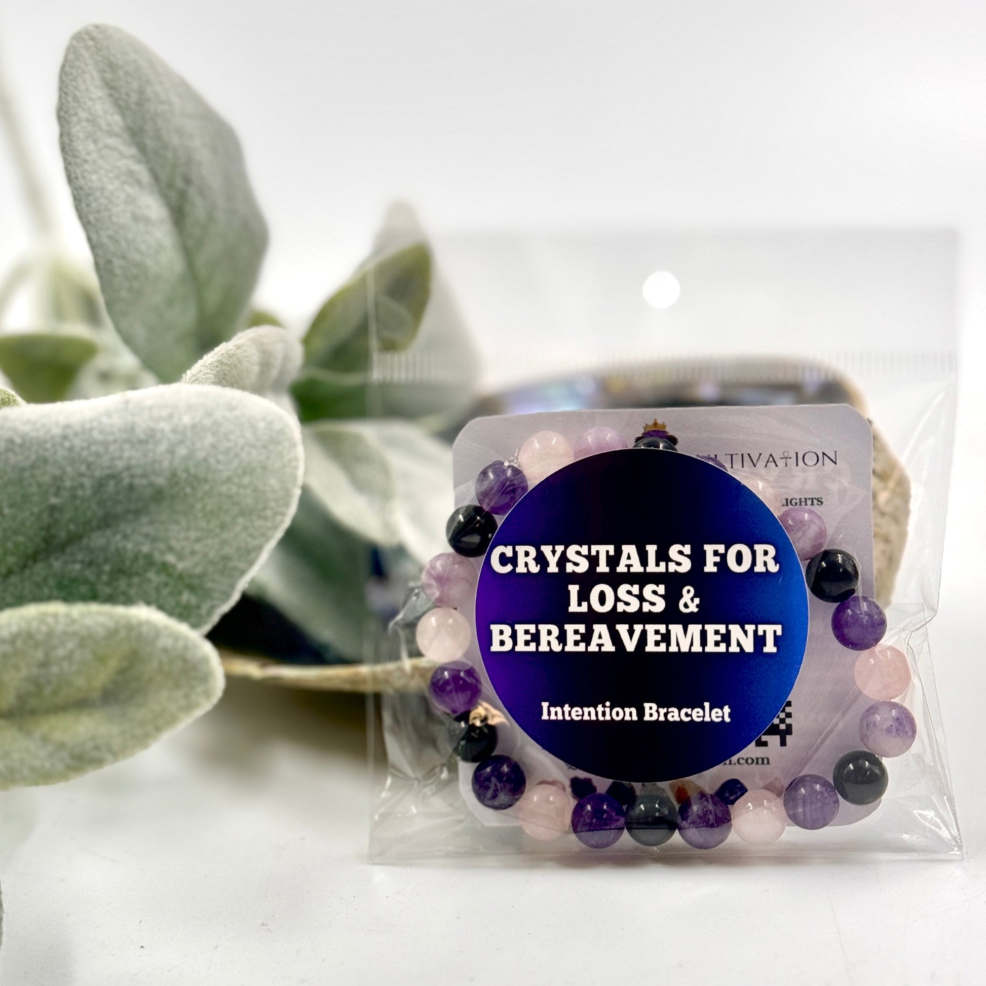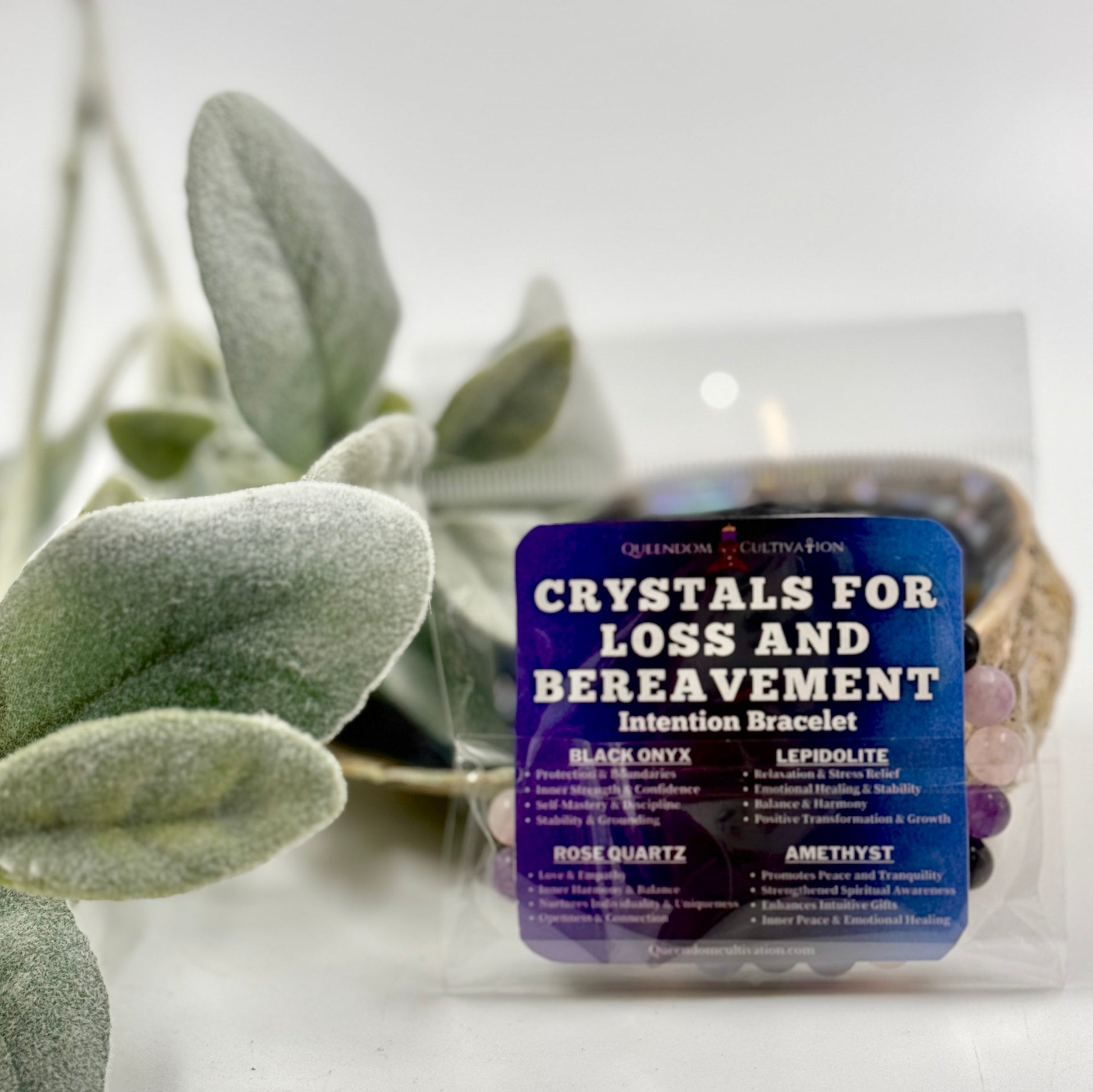 Crystals include: Black Onyx, Lepidolite, Rose Quartz and Amethyst.