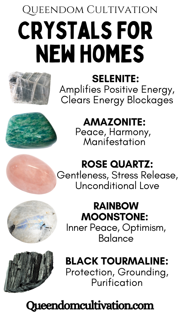(5) Crystals: Selenite, Amazonite, Rose Quartz, Rainbow Moonstone and Black Tourmaline.