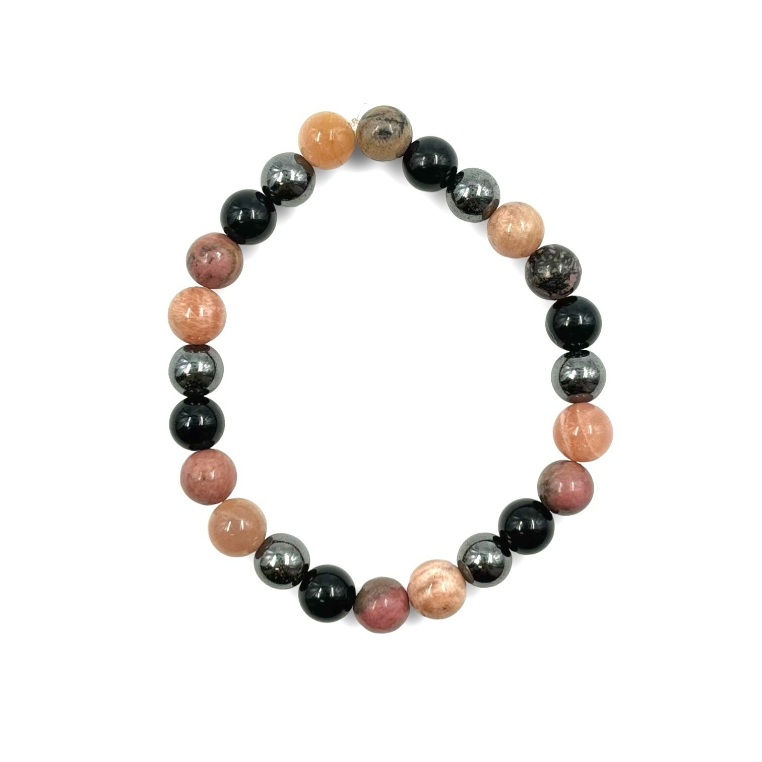 Crystals include: Black Onyx, Peach Moonstone, Hematite and Rhodonite.