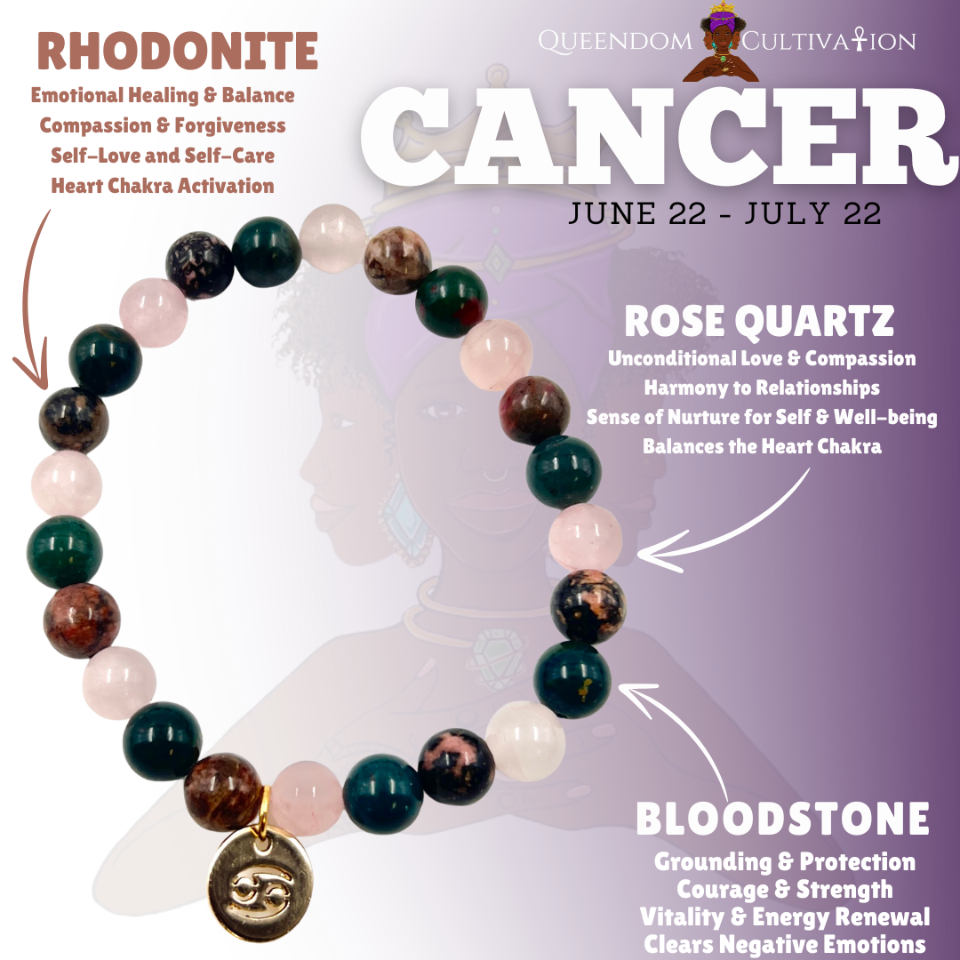 Featuring a beautiful combination of Rose Quartz, Rhodonite, and Bloodstone. Each of these stones has a unique set of properties that work together to help Cancer lead a more balanced life, mentally, physically and spiritually.