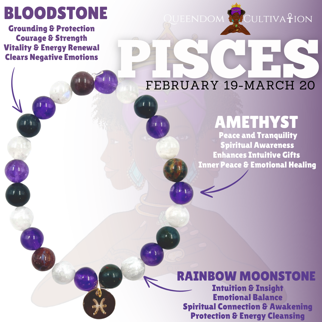 A powerful combination of Rainbow Moonstone, Amethyst, and Bloodstone. Each of these stones has a unique set of properties that work together to help Pisces lead a more balanced life, mentally, physically, and emotionally.